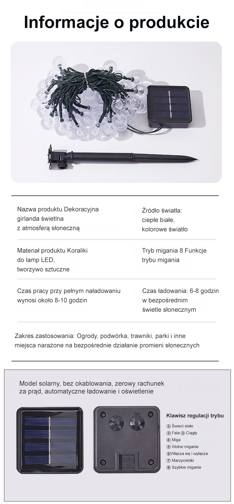 Słoneczna girlanda 8 trybów (6 5 m 30 świateł)